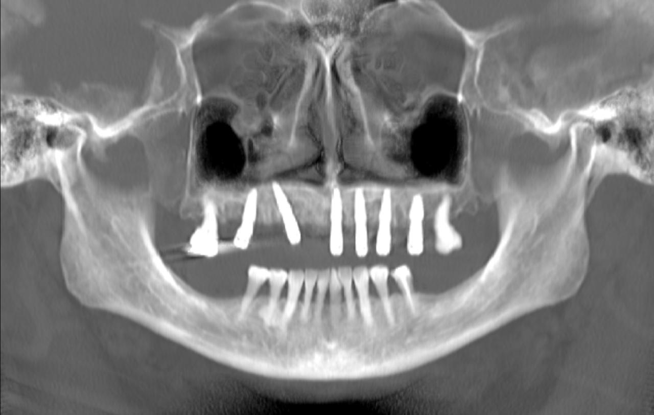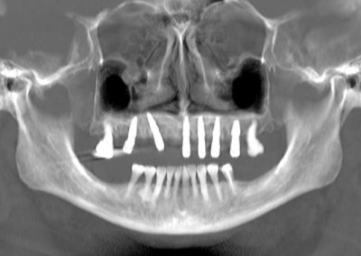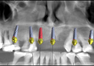 La intervención se realizó bajo anestesia general y contempló la extracción de la totalidad de los dientes del maxilar superior debido a una enfermedad periodontal avanzada, junto con la instalación simultánea de seis implantes dentales mediante cirugía guiada por planificación digital. En este caso, no se efectuó carga inmediata: el plan considera una carga temprana dentro del proceso de rehabilitación.