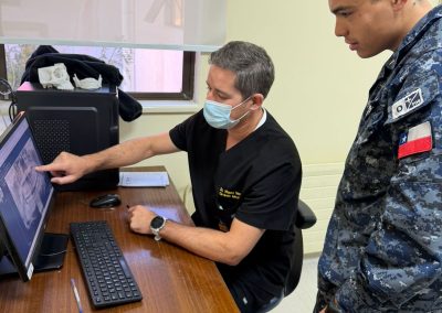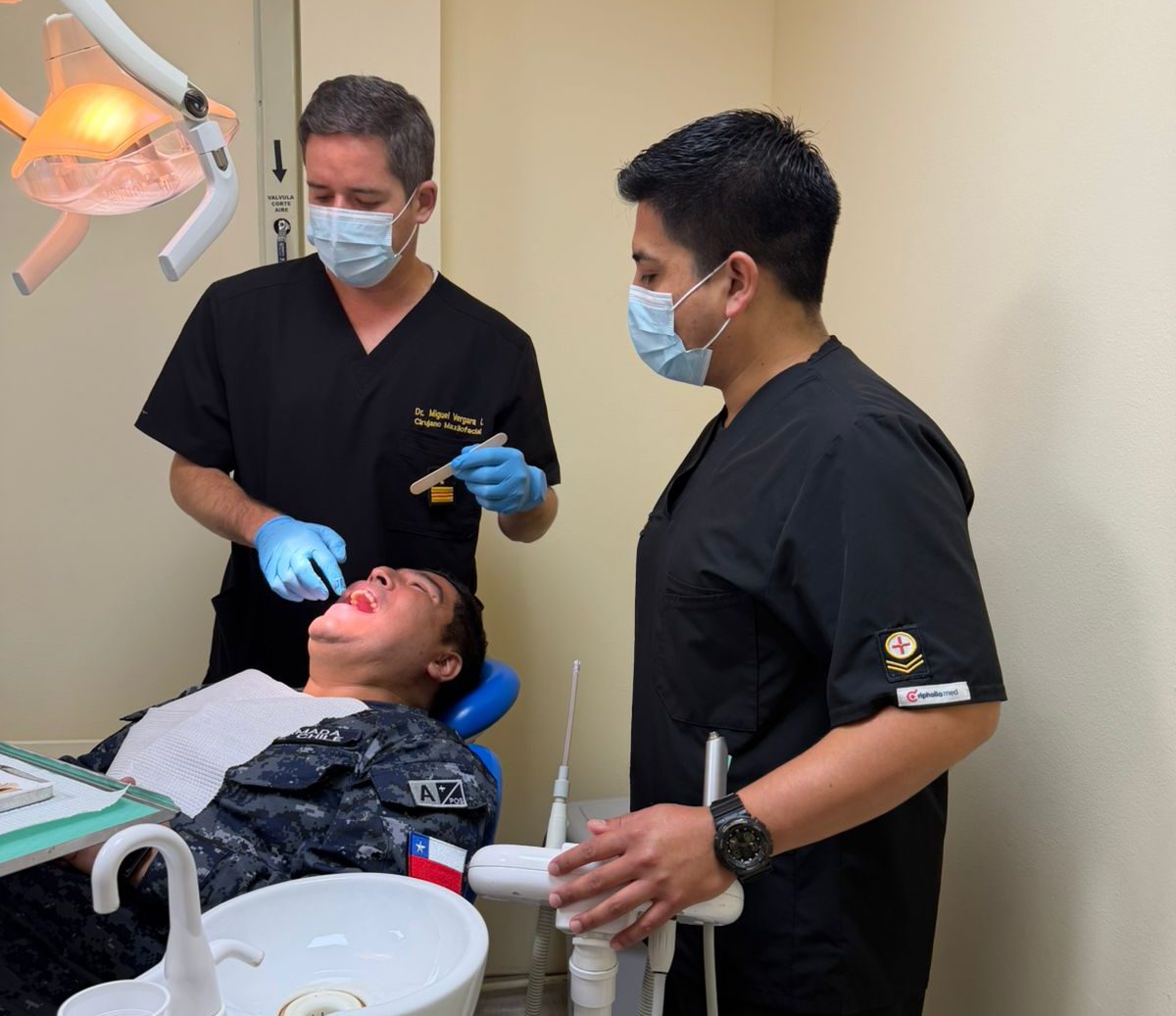 Bajo la conducción del Jefe del Servicio de Cirugía Maxilofacial del Hospital Naval “Almirante Nef”, CC SD Miguel Vergara Iturriaga, y en coordinación con la Teniente 1° SD Natalia Tornel Casanova, Oficial de Sanidad Dental del Buque Escuela “Esmeralda”, se desarrolló un operativo clínico para evaluar y tratar a 28 servidores del buque antes de su zarpe.